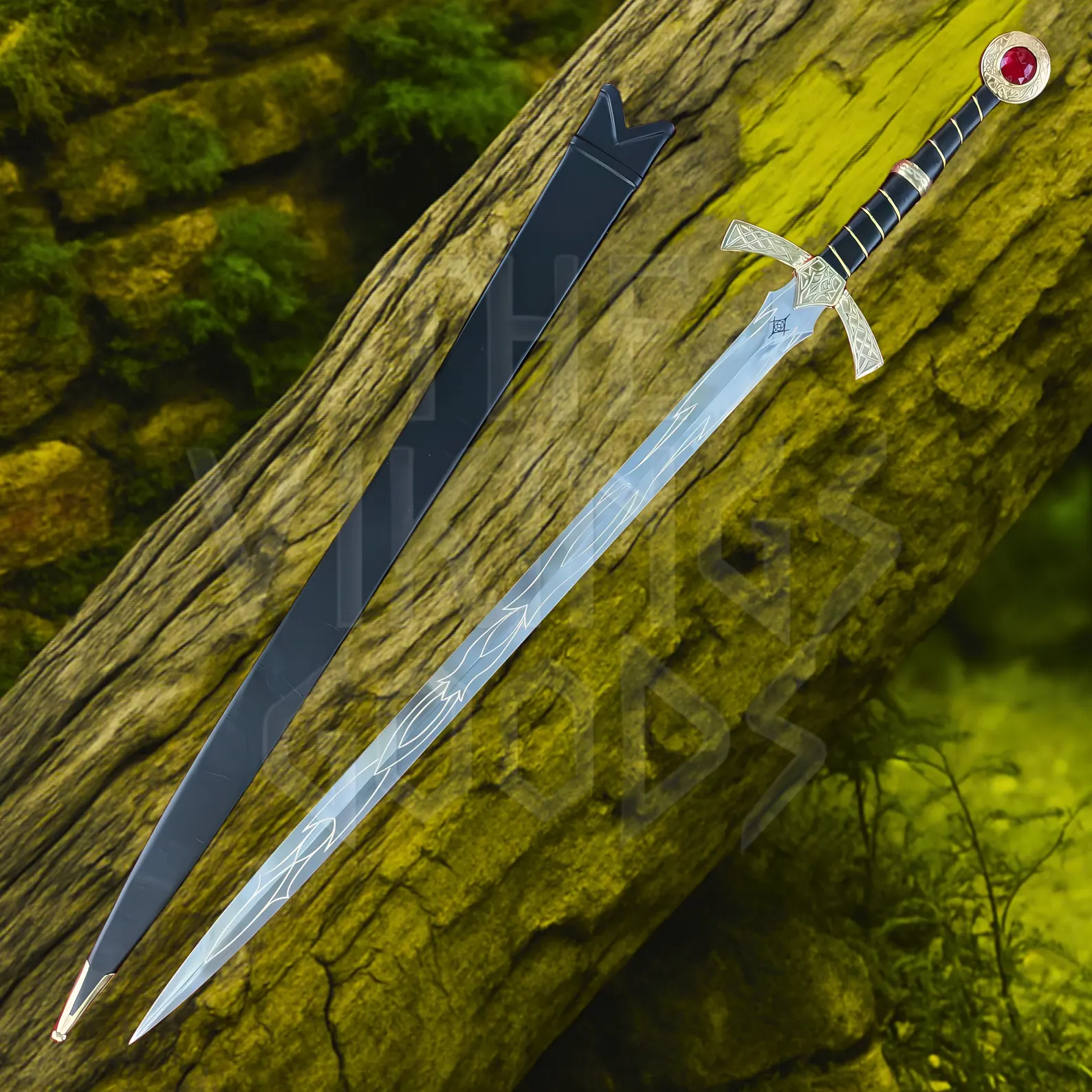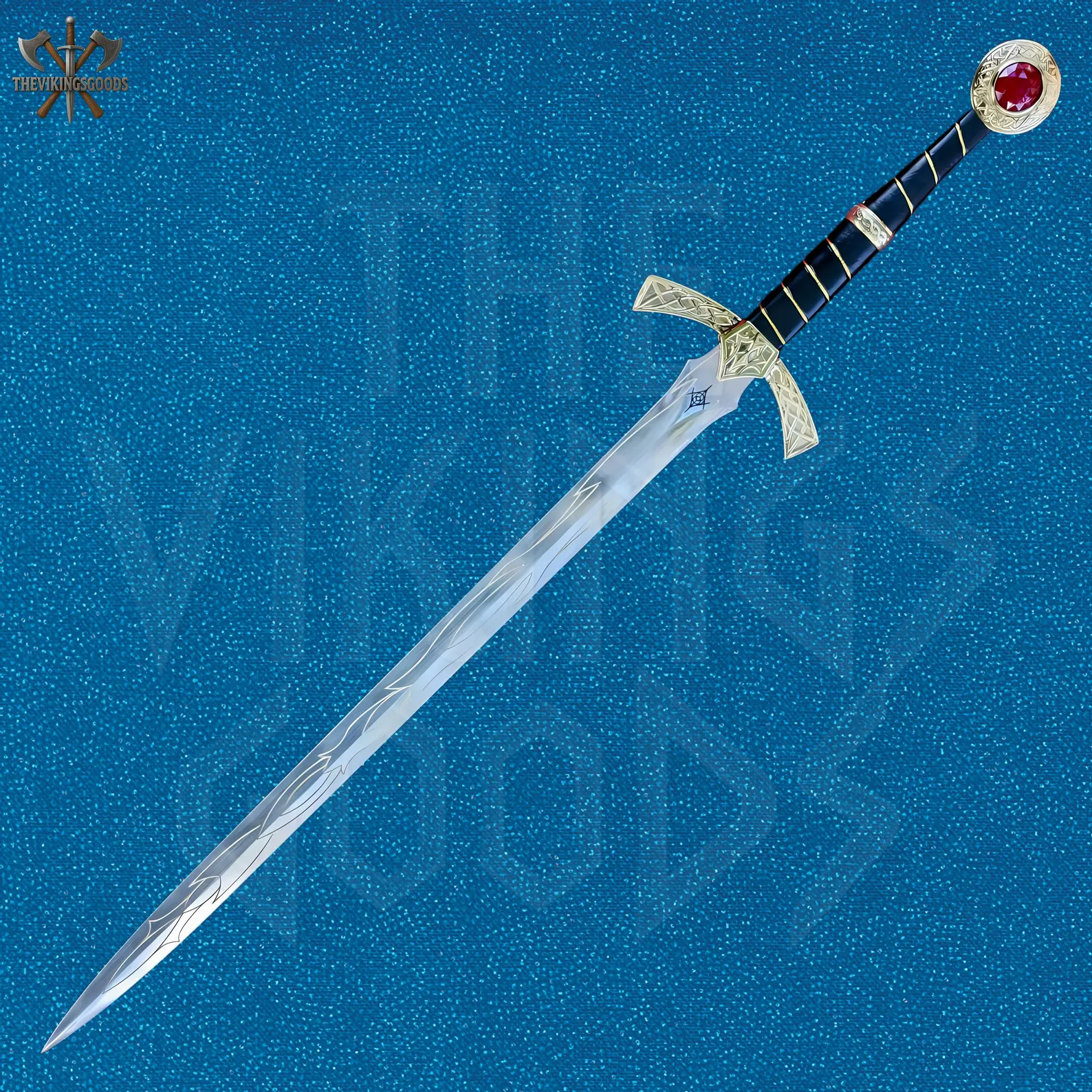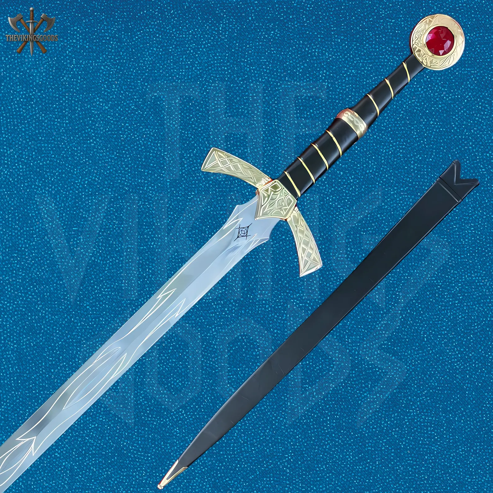 This stunning Goldryn inspired sword is a true collector’s fantasy piece. Etched with intricate Celtic knotwork, golden detailing, and ruby-colored accents, it’s designed for those who appreciate regal weaponry with mythical elegance. Whether displayed in a collection or given as a fantasy-themed gift, this Goldryn inspired sword captures a bold and legendary look.